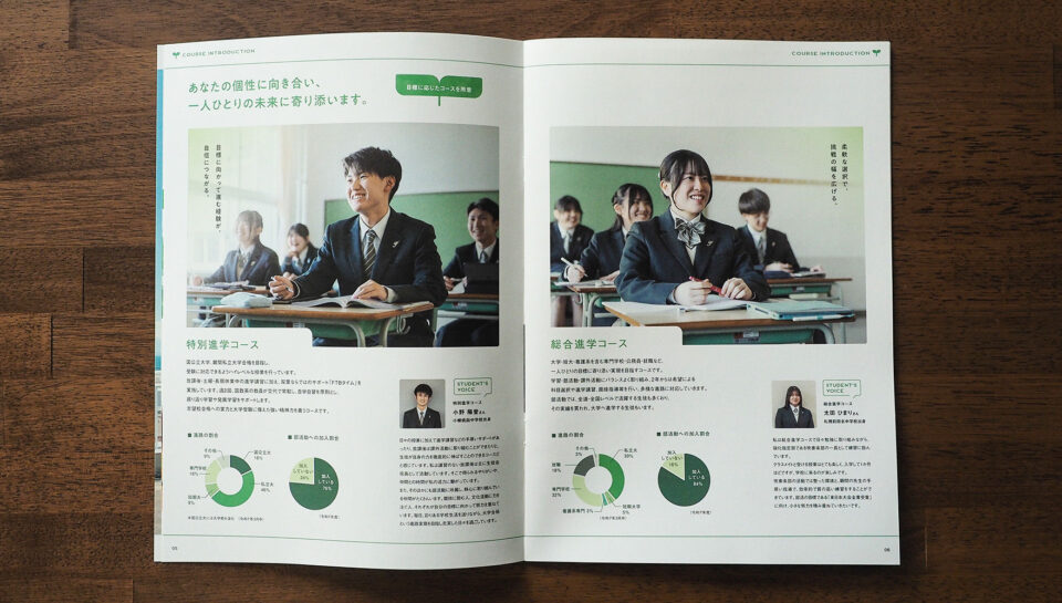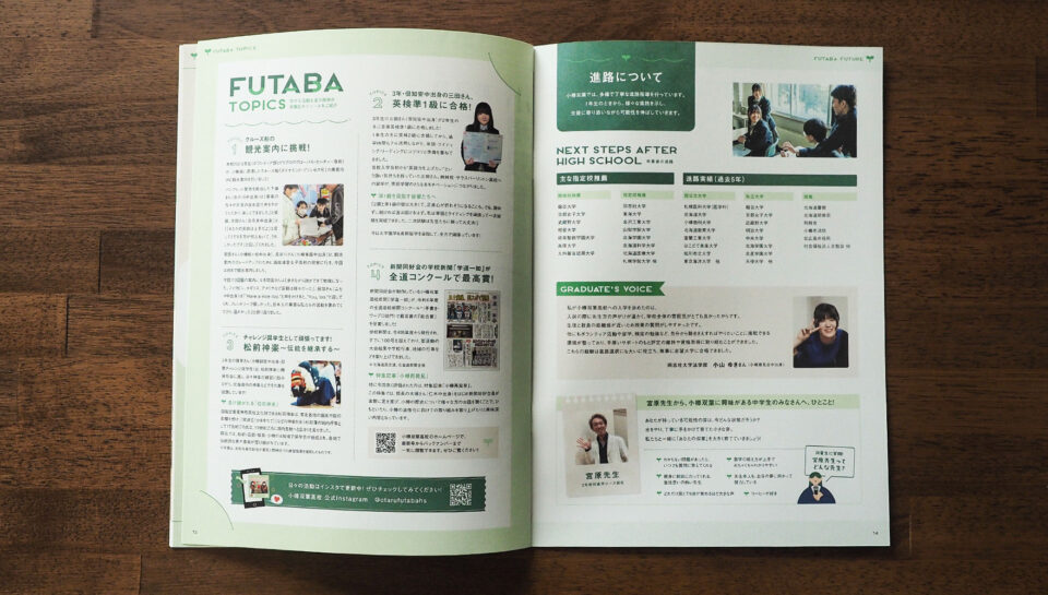 小樽双葉高校様の誠実で真面目さを大切にしながらも、取材で受け取った穏やかさ、やさしい雰囲気が伝わるよう、コピーライティングとデザインそれぞれに役割を持たせています。また、パンフレットを手に取ったときの紙の質感からも「小樽双葉らしさ」を感じられるよう、素材選定にも工夫を凝らしました。